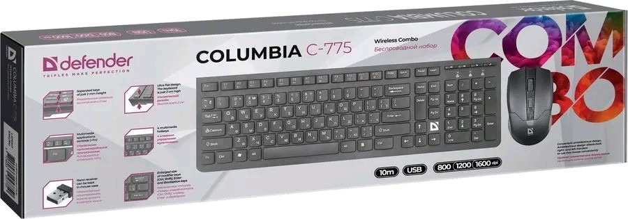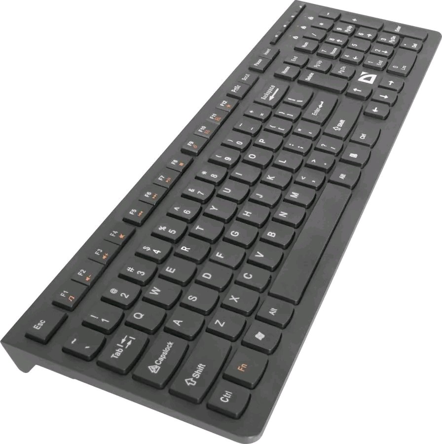 USB, радиус 10м, клавиатура беспроводная, мембранная, slim, доп клавиши 12(+FN) питание клав. 2-AAА, мышь 2-AАA, 800-1600dpi, черный