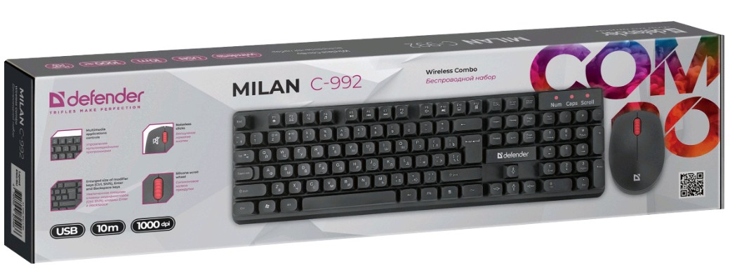 USB, радиус 10м, клавиатура беспроводная, мембранная, 104клавиши + 12(+FN) доп., питание клав. 1-AA, мышь 2-AАA, 1000dpi, белый