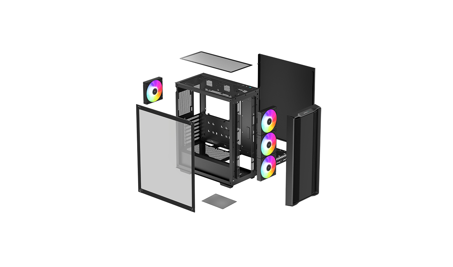 ATX, Cooler height 165mm, VGA 320(370)mm, PSU is down(max length: 10mm); 3,5*2, 2,5*2+1, USB 3.0*1, USB 2.0*1, Audio*1, PCI *7, Include 3x120mm ARGB LED Fans Rear, 1x120mm ARGB LED Fan Rear, 432*215*483mm, 7.2kg, Tempered Glass, SPCC+PLASTIC (ABS)
