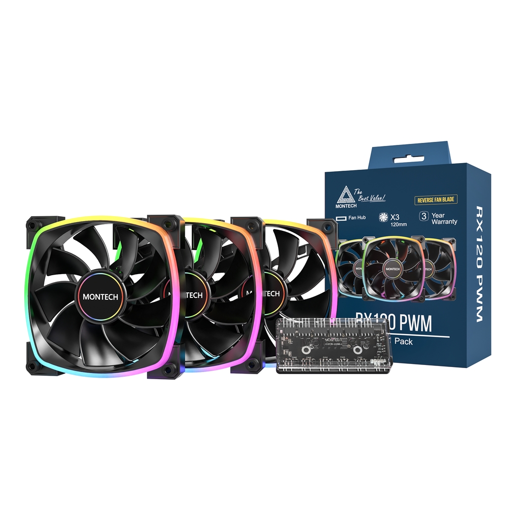 Комплект вентиляторов (3 шт.) Montech RX120 PWM Reverse Black / 120mm, 4pin PWM, 3pin ARGB, 800-1600RPM, 59.0CFM, 27.0dBA, Rifle bearing / RX120B3P