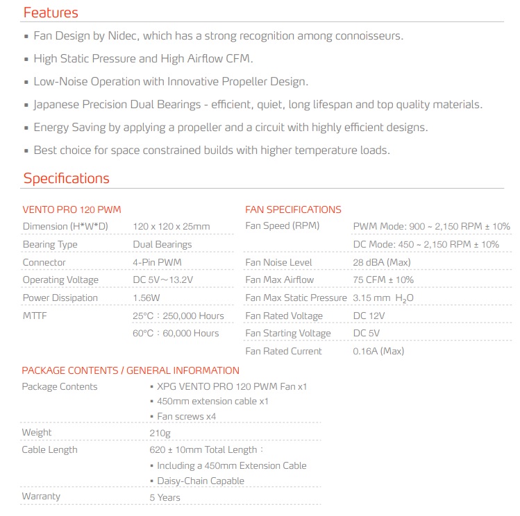 XPG VENTO Pro 120 PWM, Black, Dual Bearings, 120mm Fan, 4-Pin PWM, Speed: PWM Mode: 900-2150 RPM, DC Mode: 450-2150 RPM, Max Air Flow: 75 CFM