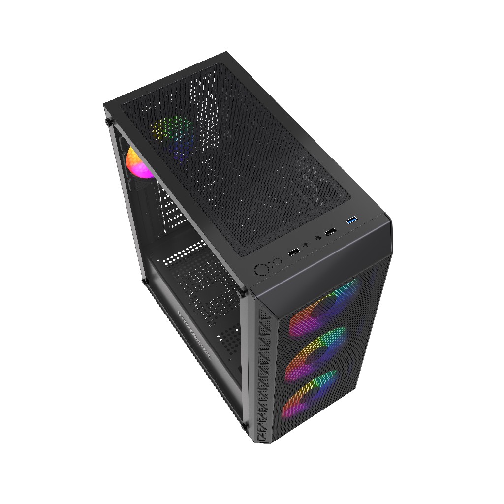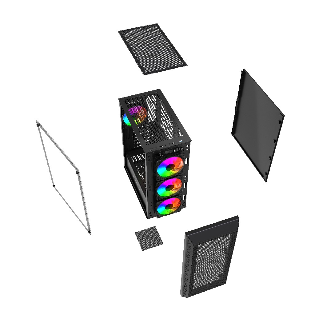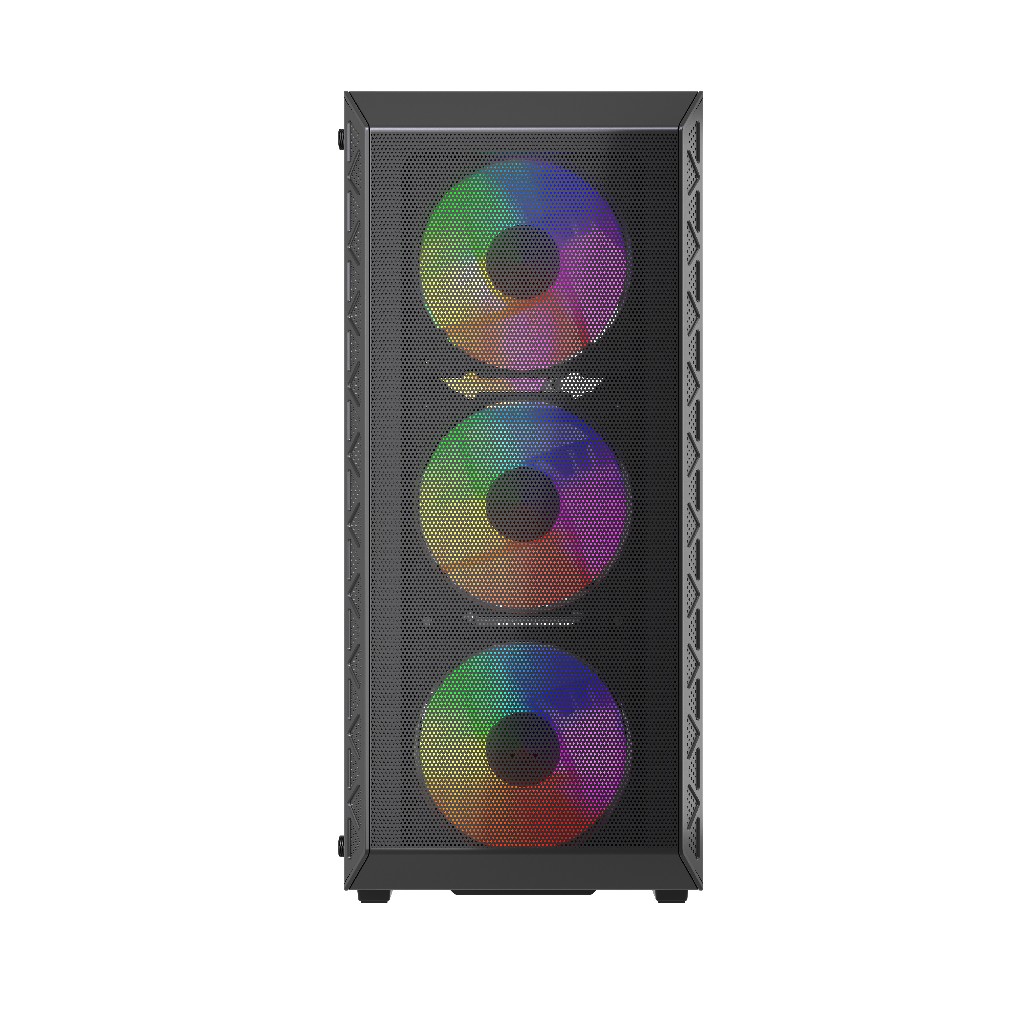 Размеры (ШхВхГ): 195x450x395mm, SPCC 0.45mm.CPU кулер 160мм (макс),VGA 310mm, PSU up to 200mm. Слоты: 3,5"х2, 2,5"х2, 7xPCI. Охлаждение: Front: 3х120мм FRGB (Fixed) fans (inc.). Rear:1х120мм FRGB fan (inc.). I/O Panel: USB3.0 x 1 / USB2.0 x 2 , HD audio.