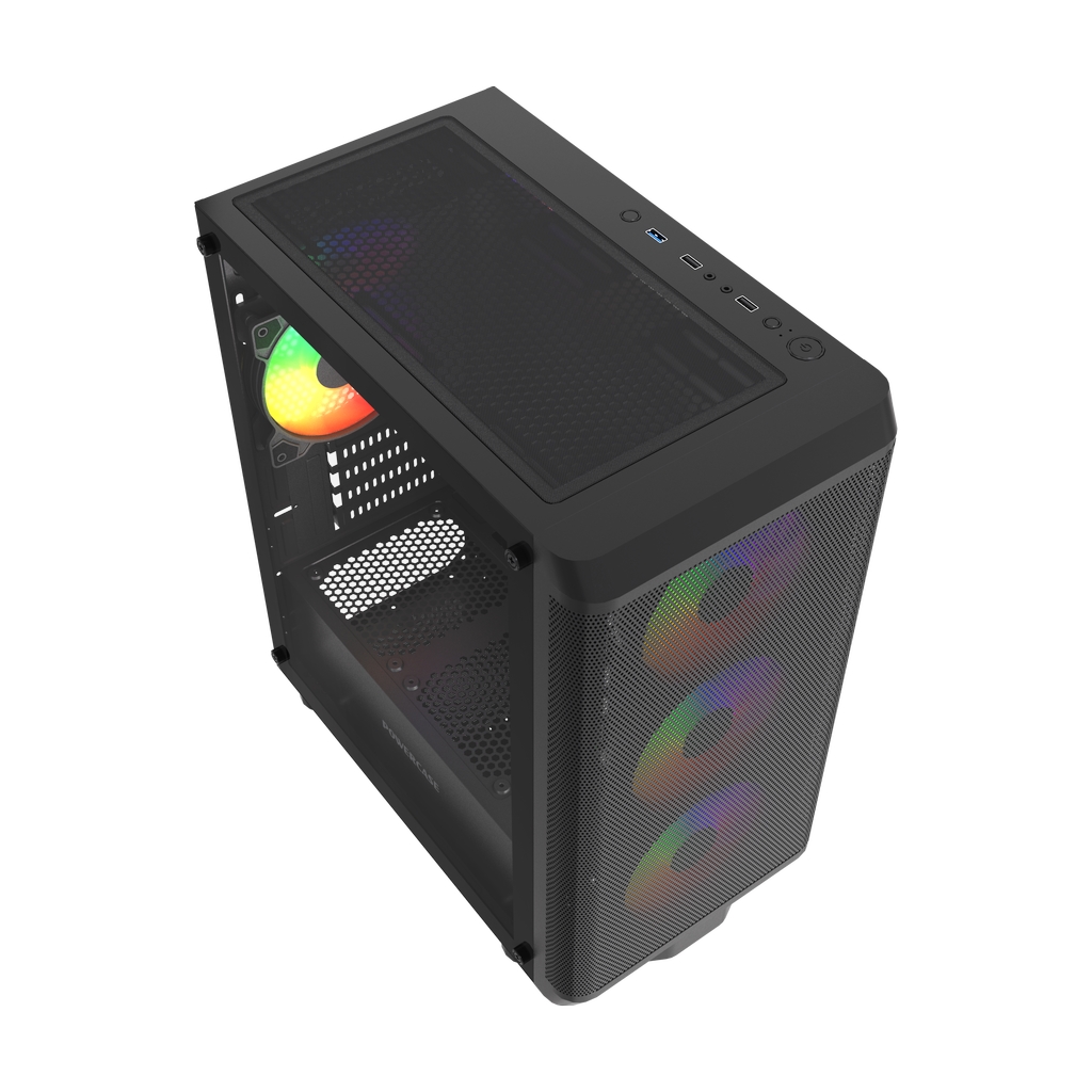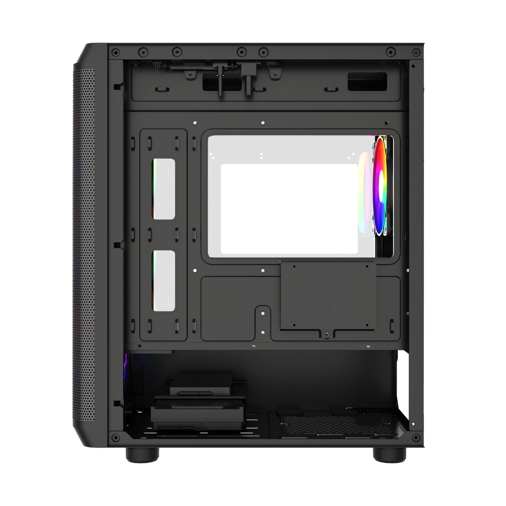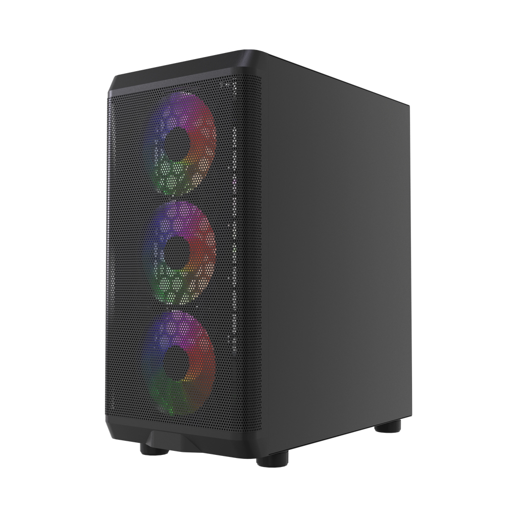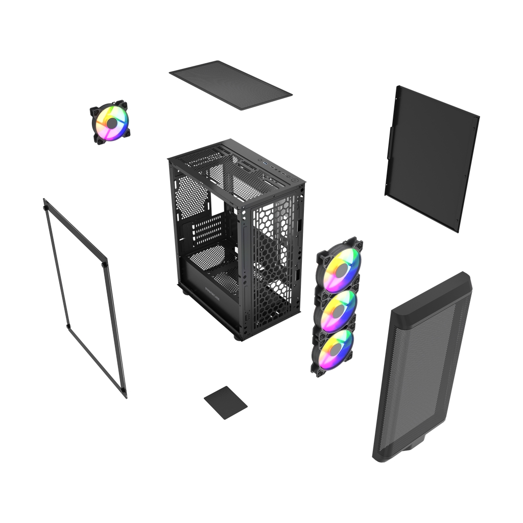 Размеры (ШхВхГ): 212x420x365mm, SPCC 0.4mm.CPU кулер 165мм (макс),VGA 300mm, PSU 170mm. Слоты: 3,5"х1, 2,5"х1, 4xPCI. Охлаждение: Front: 3х120мм FRGB fans (inc.). Top: 3х120мм, Rear: 1х120мм FRGB fan (inc.). I/O Panel: USB3.0 x 1 / USB2.0 x 2 , HD audio.