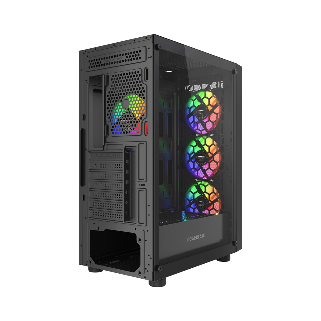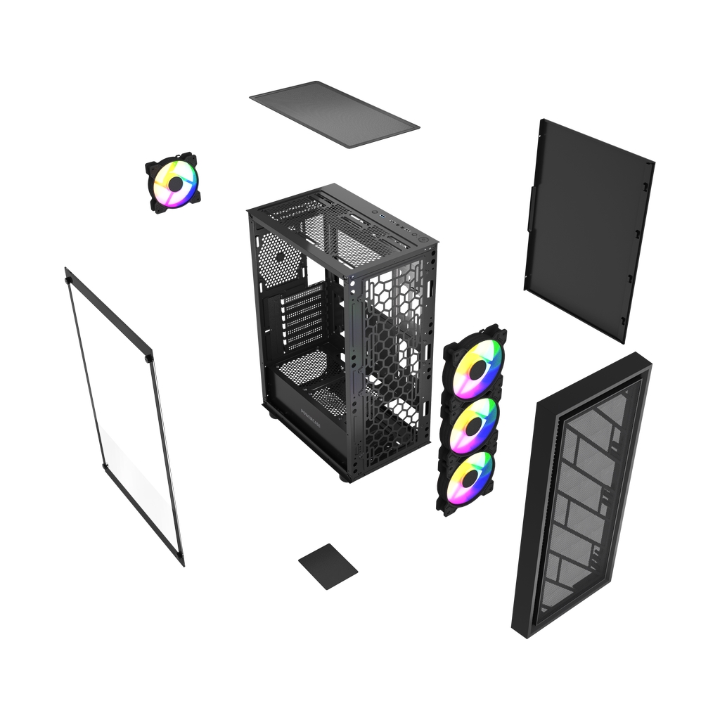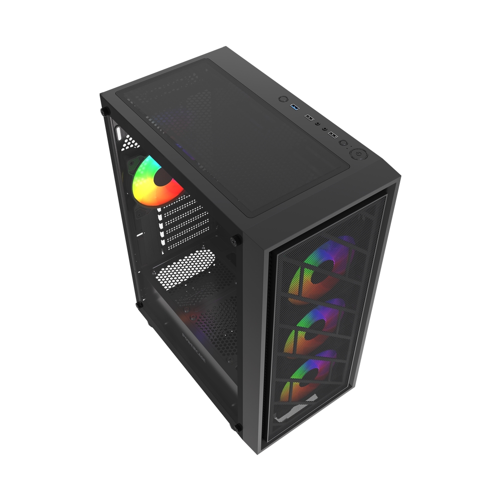 Размеры (ШхВхГ): 212x470x365mm, SPCC 0.45mm.CPU кулер 165мм (макс),VGA 300mm, PSU up to 170mm. Слоты: 3,5"х1, 2,5"х2, 7xPCI. Охлаждение: Front: 3х120мм FRGB fans (inc.). Rear:1х120мм FRGB fan (inc.). I/O Panel: USB3.0 x 1 / USB2.0 x 2 , HD audio.