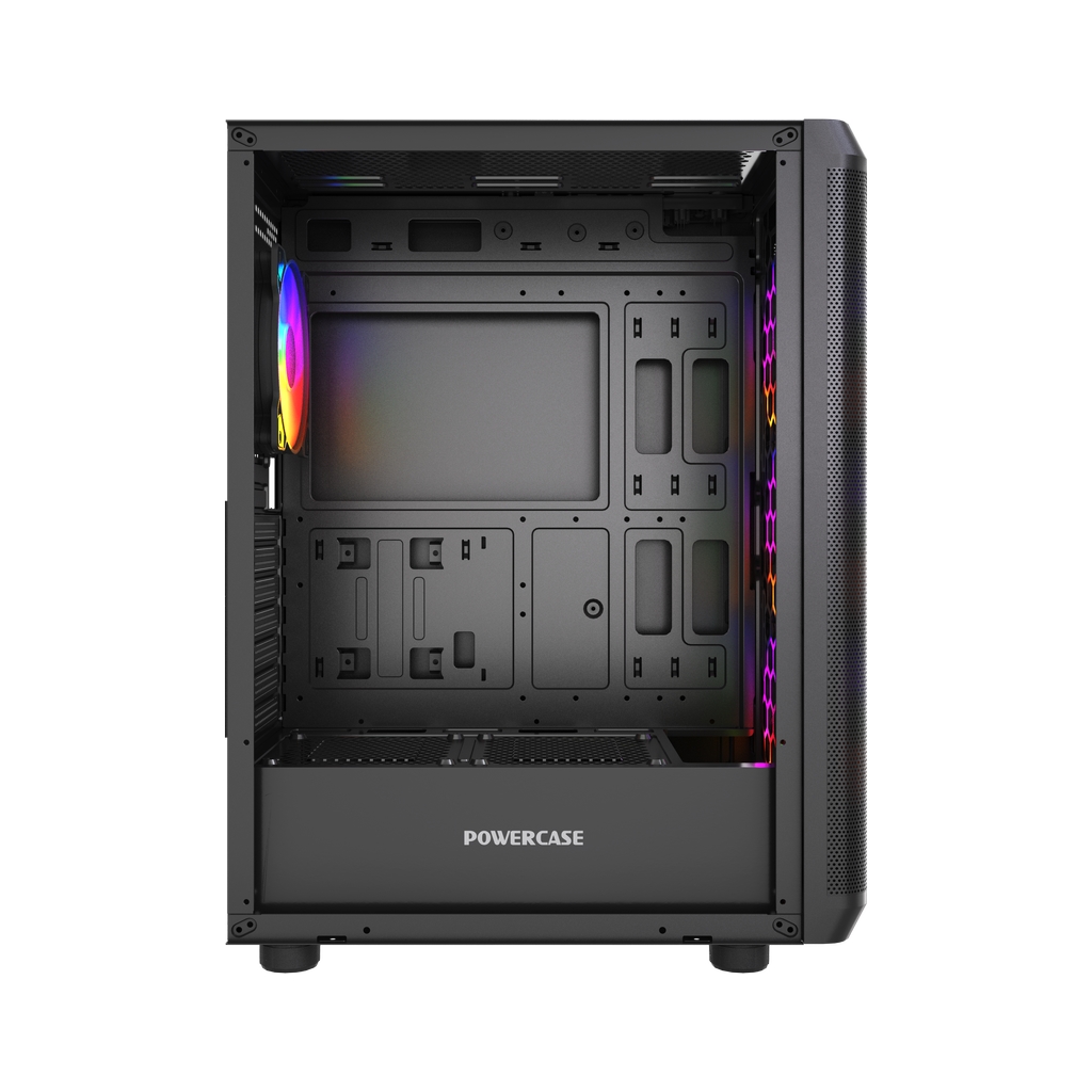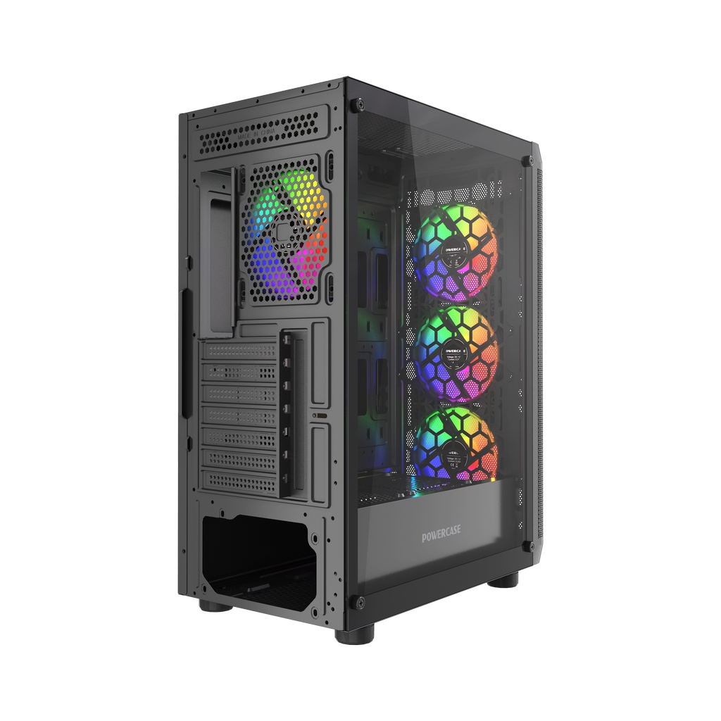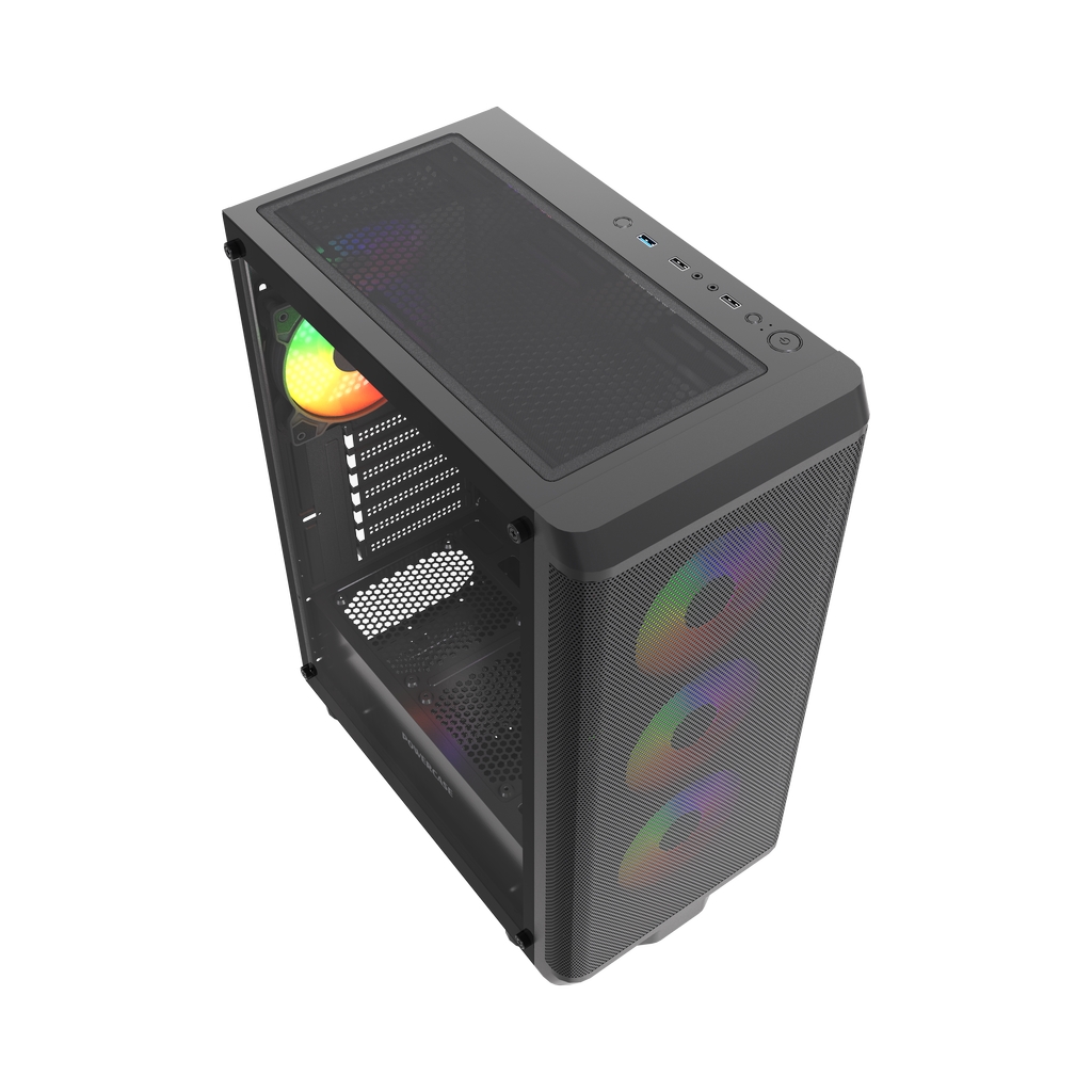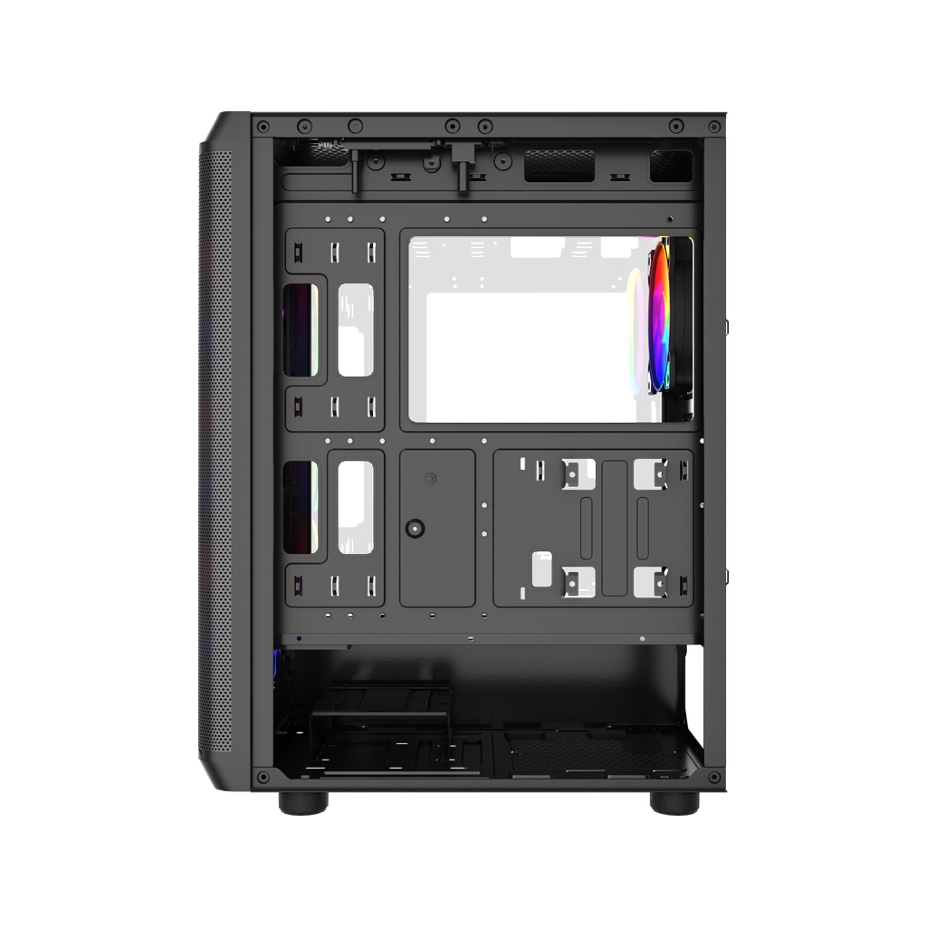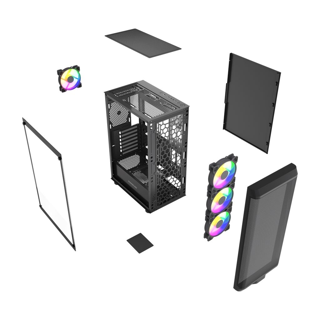 Размеры (ШхВхГ): 212x470x365mm, SPCC 0.45mm.CPU кулер 165мм (макс),VGA 300mm, PSU up to 170mm. Слоты: 3,5"х1, 2,5"х2, 7xPCI. Охлаждение: Front: 3х120мм FRGB fans (inc.). Rear:1х120мм FRGB fan (inc.). I/O Panel: USB3.0 x 1 / USB2.0 x 2 , HD audio.