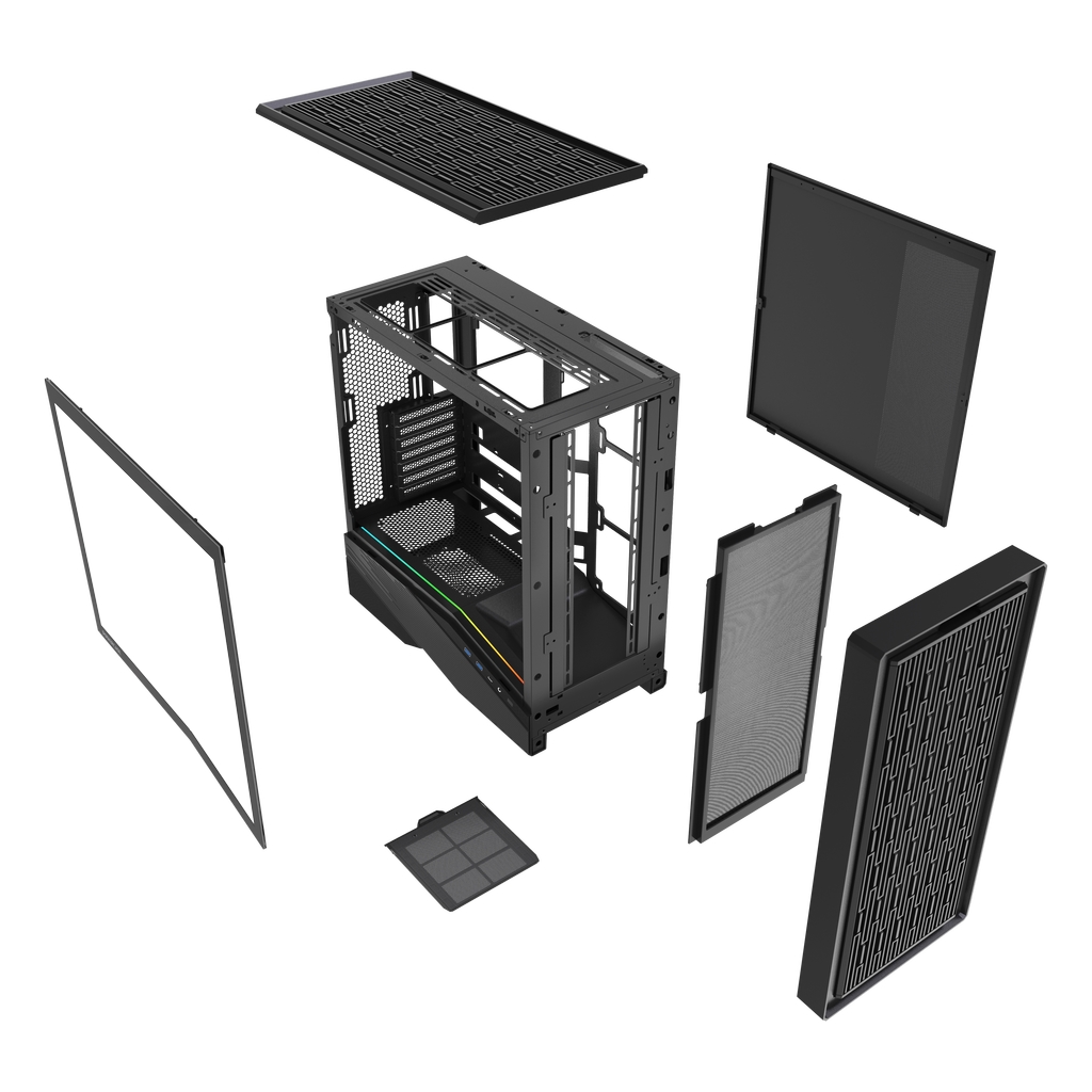Размеры Ш*В*Г: 235x475x466мм, SPCC 0.7mm, VGA 395mm (с вентиляторами на фронтальной панели), CPU 182mm (Max.), Water cooler: 240/360mm on top, 3.5''HDD x 1, 2.5''SSD x 1, USB3.0 x 2+Type-C x 1, HD Audio