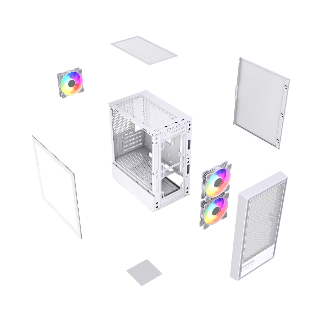 Размеры (ШхВхГ): 195x387x335mm,SPCC 0.45mm.CPU кулер 160мм (макс),VGA 300mm, PSU 160mm. Слоты: 3,5"х1, 2,5"х2, 4xPCI. Охлаждение: Front: 2х120мм ARGB (inc.).Top: 2х120/140мм, Rear: 1х120мм ARGB (inc.). I/O Panel: USB3.0 x 1 / USB2.0 x 2 , HD audio.