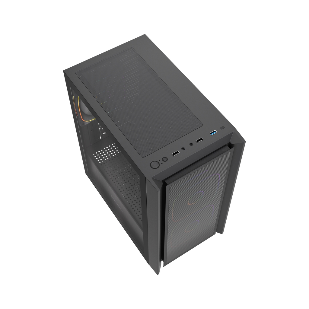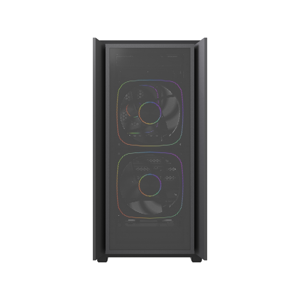 Размеры (ШхВхГ): 195x387x345mm,SPCC 0.45mm.CPU кулер 160мм (макс),VGA 300mm, PSU 160mm. Слоты: 3,5"х1, 2,5"х2, 4xPCI. Охлаждение: Front: 2х120мм ARGB fans (inc.). Top: 2х120мм, Rear: 1х120мм ARGB fan (inc.). I/O Panel: USB3.0 x 1 / USB2.0 x 2 , HD audio.