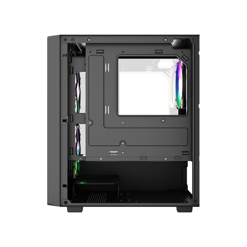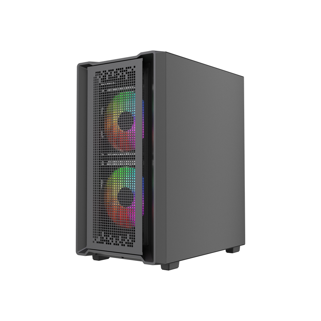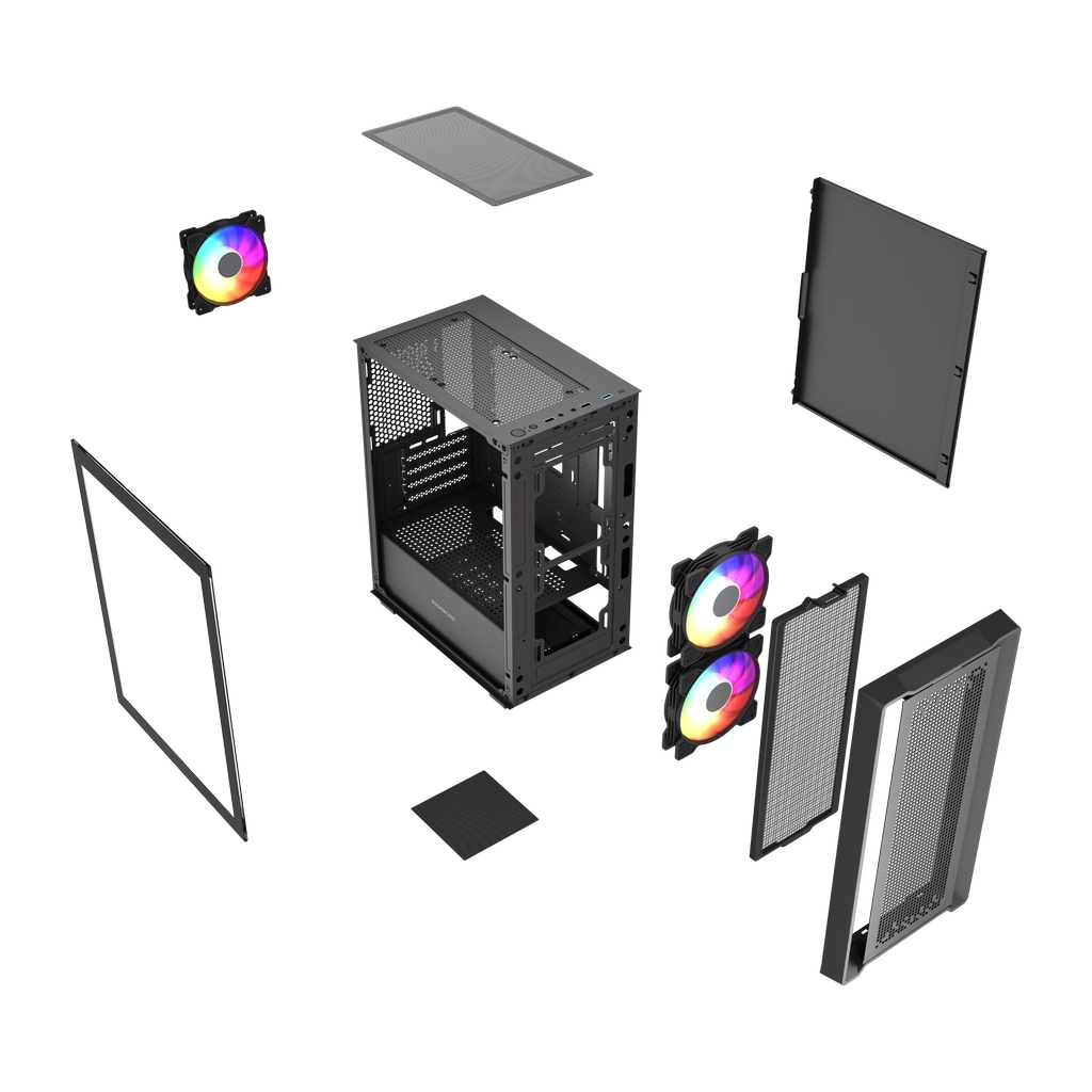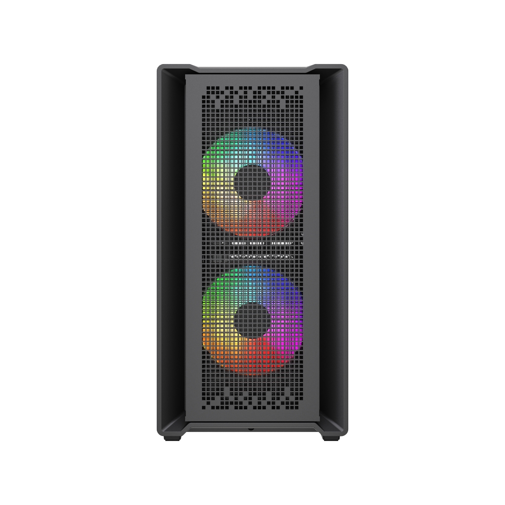 Размеры (ШхВхГ): 195x387x345mm,SPCC 0.45mm.CPU кулер 160мм (макс),VGA 300mm, PSU 160mm. Слоты: 3,5"х1, 2,5"х2, 4xPCI. Охлаждение: Front: 2х120мм ARGB fans (inc.). Top: 2х120мм, Rear: 1х120мм ARGB fan (inc.). I/O Panel: USB3.0 x 1 / USB2.0 x 2 , HD audio.