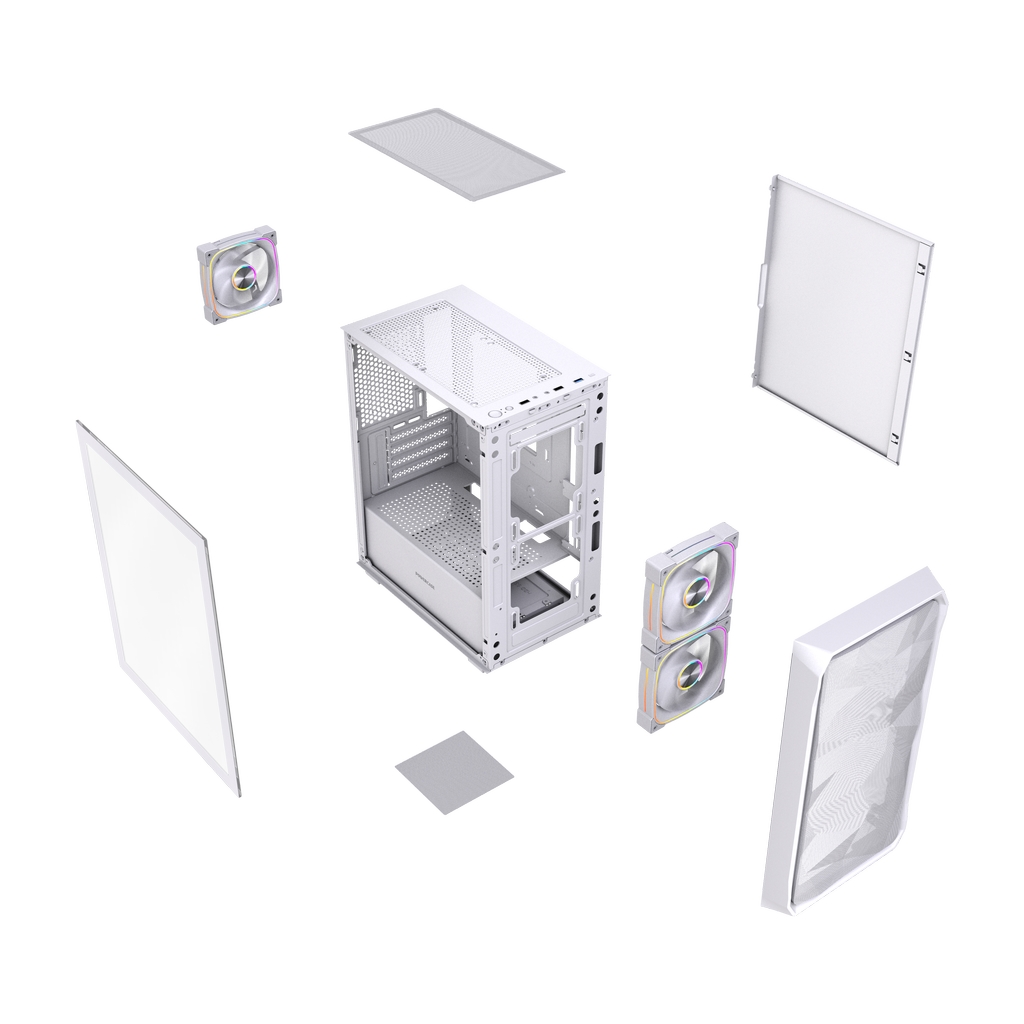 Размеры (ШхВхГ): 195x387x345mm,SPCC 0.45mm.CPU кулер 160мм (макс),VGA 300mm, PSU 160mm. Слоты: 3,5"х1, 2,5"х2, 4xPCI. Охлаждение: Front: 2х120мм ARGB fans (inc.). Top: 2х120мм, Rear: 1х120мм ARGB fan (inc.). I/O Panel: USB3.0 x 1 / USB2.0 x 2 , HD audio.