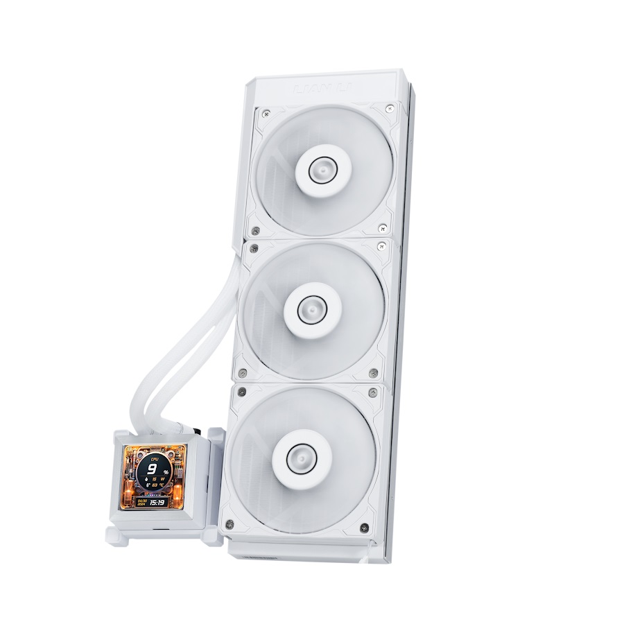 Радиатор: 403х124.5х27mm, Intel: LGA 1700, AMD: AM5 / AM4. Вентилятор: 3х 120mm PWM Fans (UNI FAN P28), шум: 29.8dBA, 3х 73.14CFM (MAX), FDB, 200-2500 об/мин. Помпа: размеры: 72x72х59mm, 1500-3800±10%RPM, LCD 2.88” IPS, 480x480 pixels