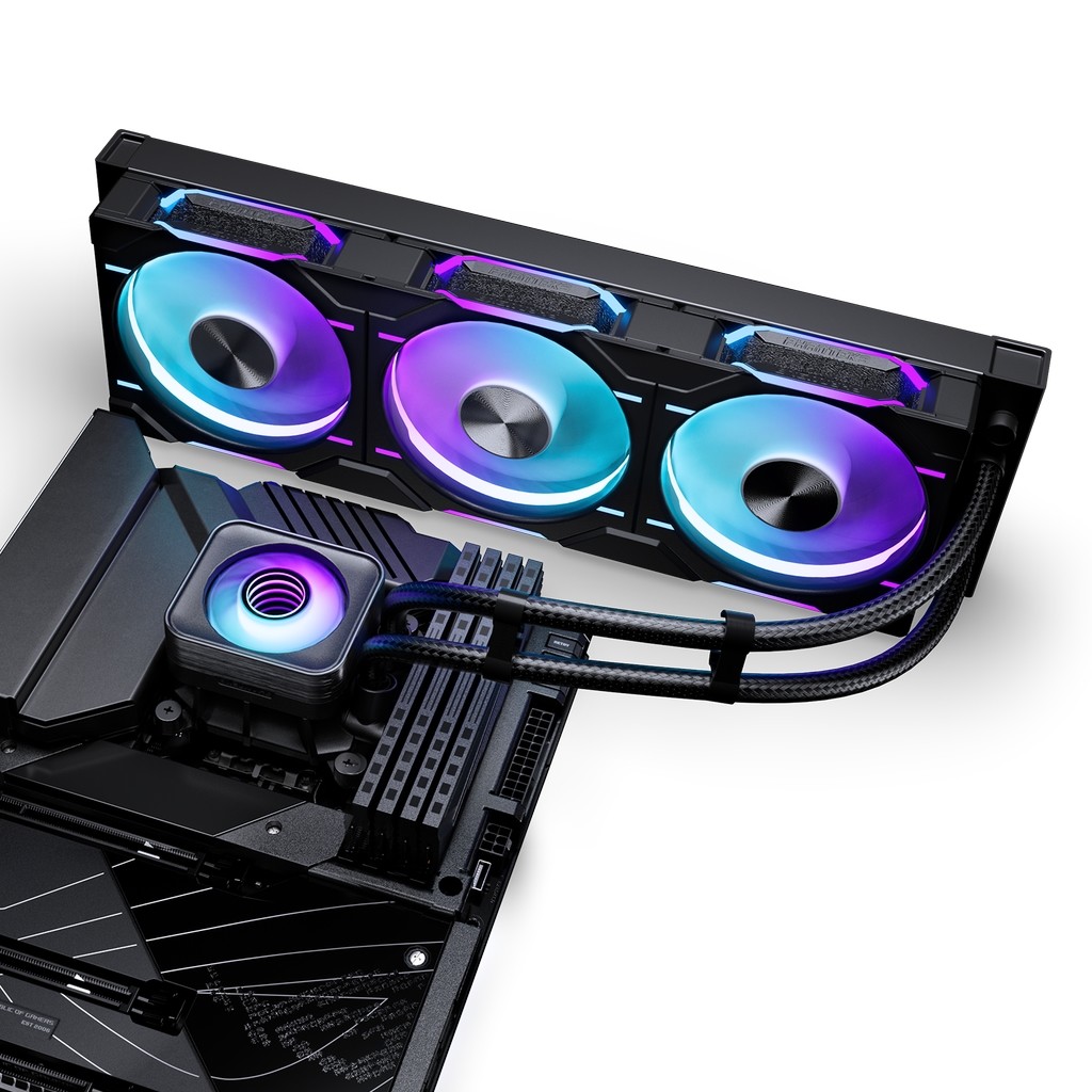 Радиатор: 397х120х27mm,Вентилятор: 3х 120mm D30 ARGB PWM Fans, шум: 30.2dBA, 3х 64.3CFM (MAX), 250-2000 об/мин. Помпа: размеры: 76x64х51.4mm, 3100±10%RPM, Подсветка: 3pin 5V ARGB.