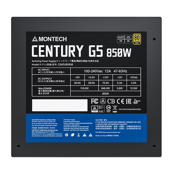 Блок питания Montech CENTURY G5 850W / ATX 3.0, APFC, 80 PLUS Gold, Full Bridge LLC, DC-DC, Japan caps, 120mm fan, full modular / CENTURYG5850