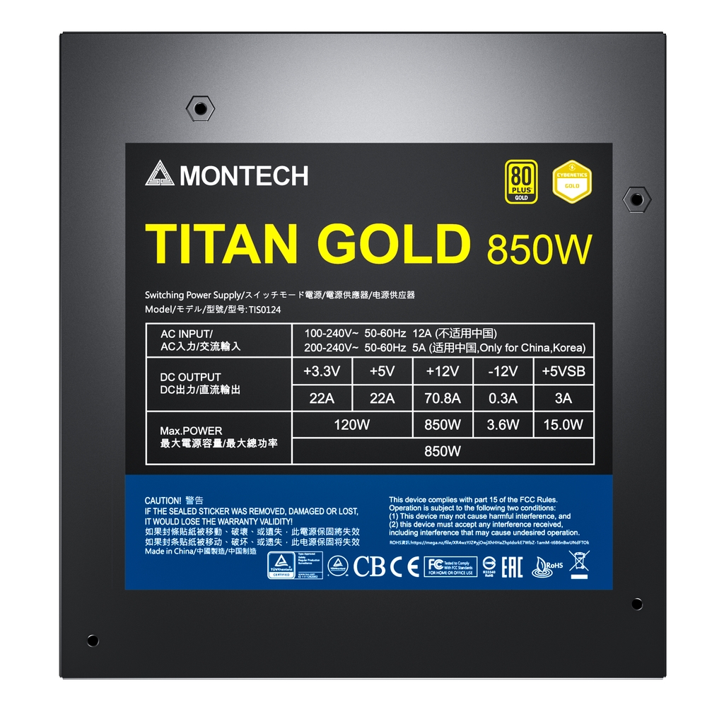 Блок питания Montech TITAN GOLD 850W / ATX 3.0, APFC, 80 PLUS Gold, Half Bridge LLC, DC-DC, Japan caps, 135mm fan, full modular / TITAN GOLD 850W